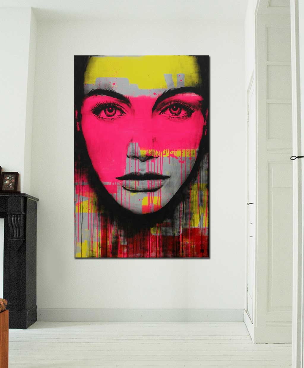 Handpainted portrait mixed with typographic shapes. This statement piece will look great in your home.
