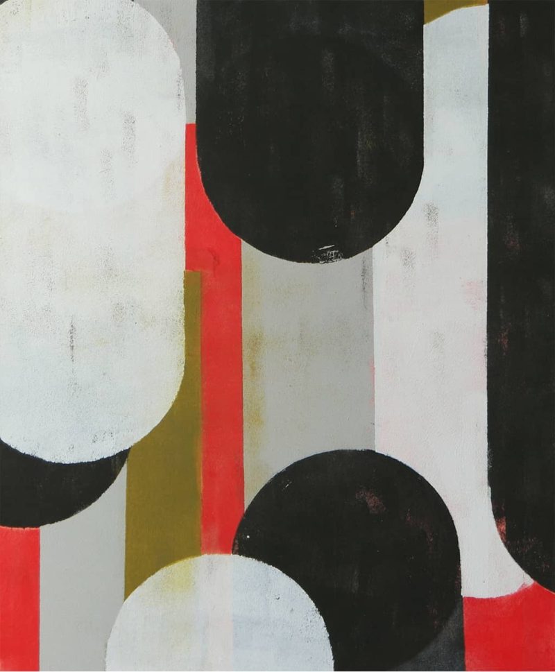 Painting with graphic shapes in contrasting colours.